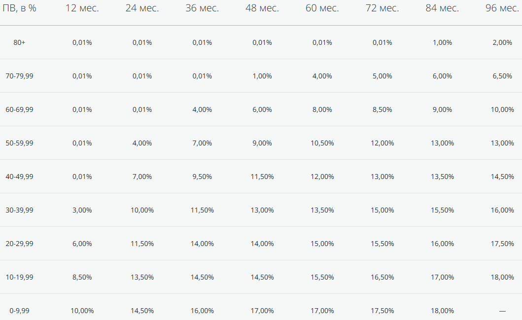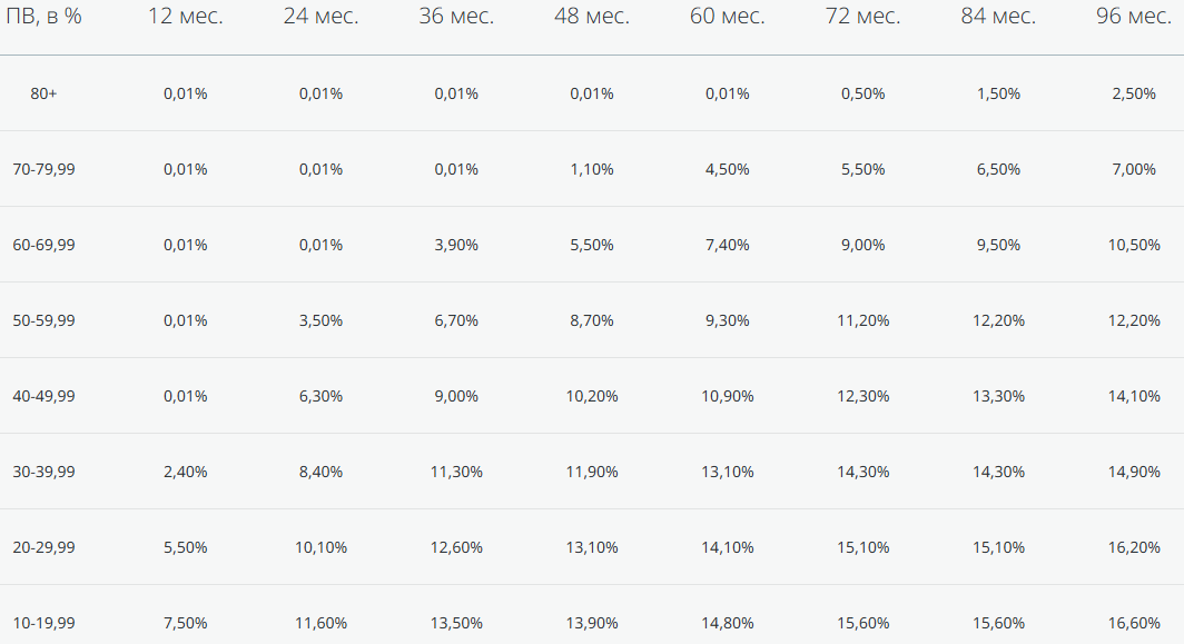 Диапазон Полной стоимости кредита в % годовых составляет от 0,005% до 17,098%. % ставка составляет от 0,010% до 16,600%, на диапазонах первоначального взноса от 10,000% до 90,000% включительно от стоимости автомобиля, при сроке кредита от 12 до 96 мес. и определяется индивидуально. Оценивайте свои финансовые возможности и риски.