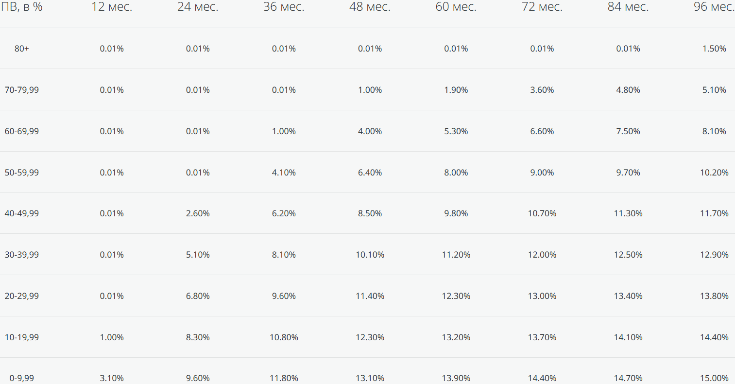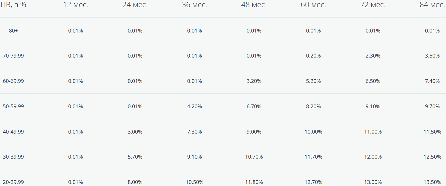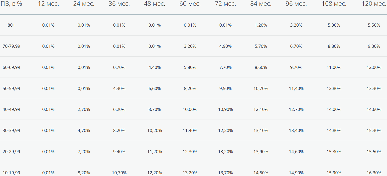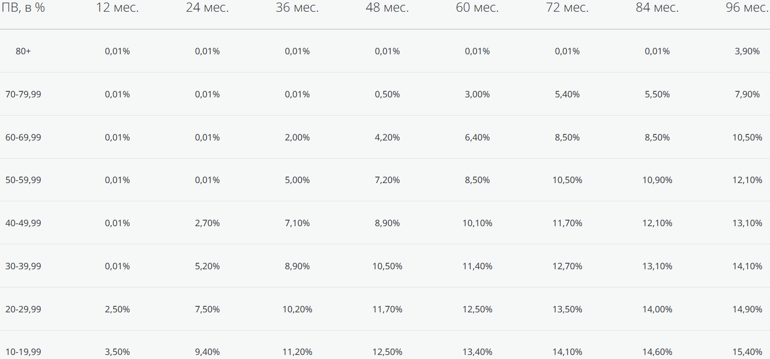 - При сроке 36 месяцев: ставка 0,01% годовых при первоначальном взносе от 70%.